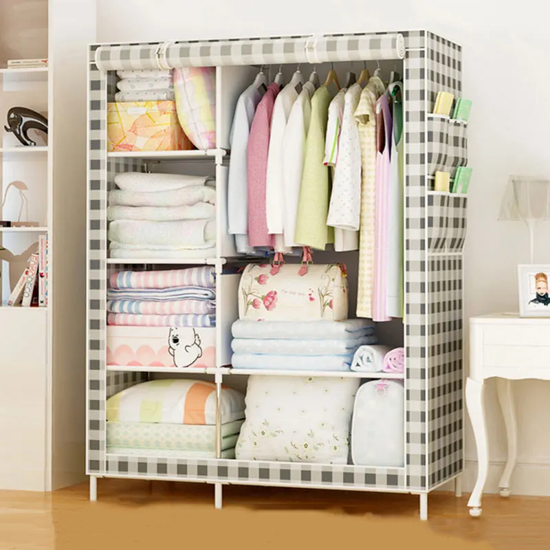 Student Single Cloth Wardrobe Folding Bedroom Small Closet Space Save Clothes Storage Cabinet With Three Curtain Design
